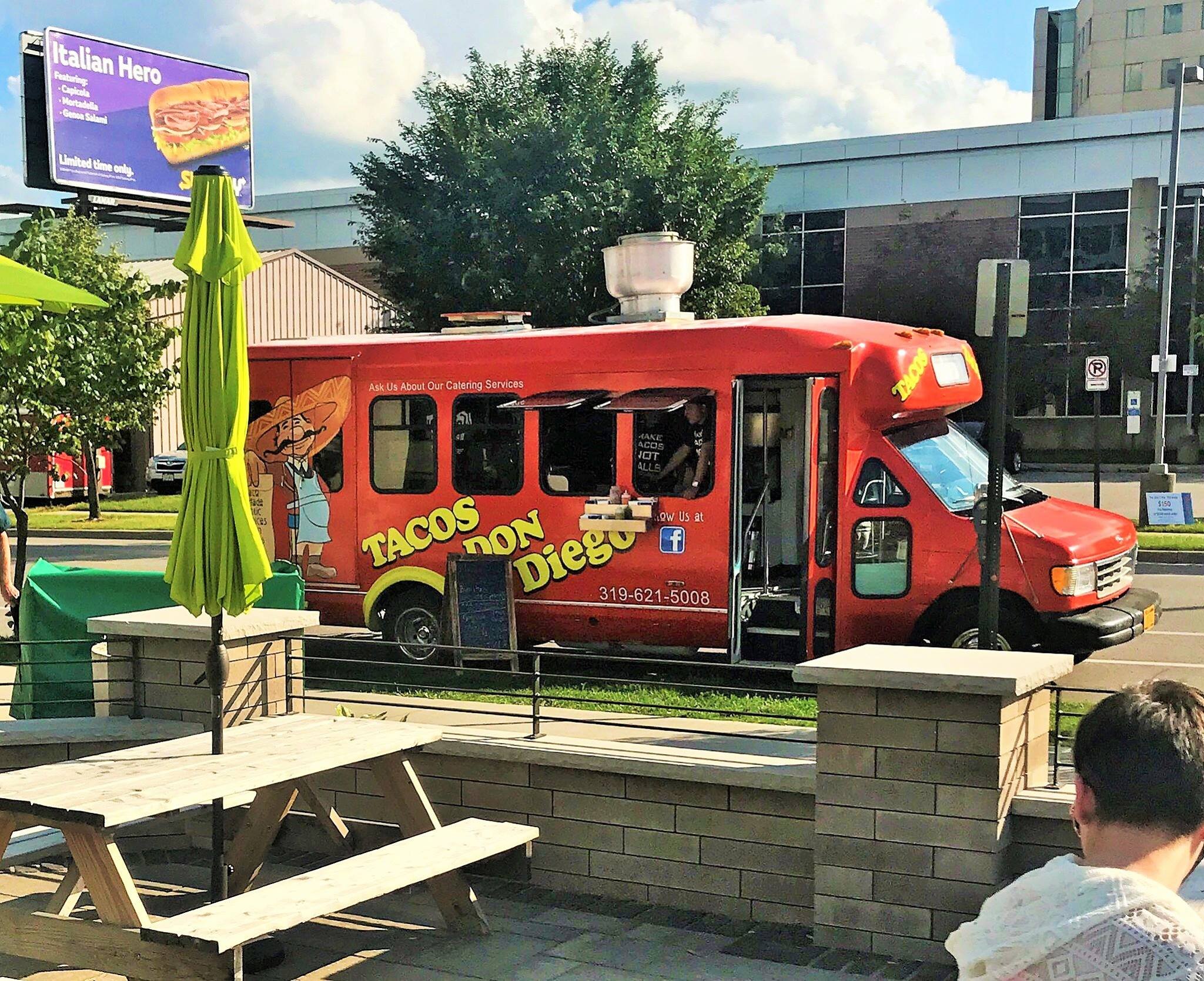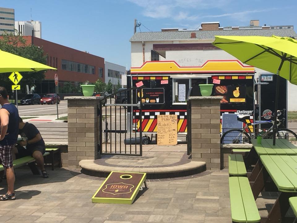 Since we do not serve food at Iowa Brewing Company, we often invite local food trucks to park outside the patio. You are welcome to enjoy your food on any of our indoor or outdoor tables!